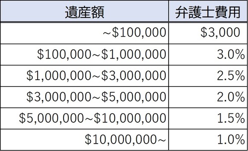 注意が必要なのがこの弁護士報酬で、かなりの高額です。たとえば、フロリダ州でプロベートを申し立てるとして、現地フロリダ州の弁護士に申立代理を依頼する場合を想定します。このとき、申立代理人に支払う費用は、フロリダ州法によって以下の算定式によって定めることが合理的として推奨されています。
