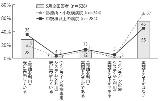 医療機関向けにマーケティングリサーチやコンサルティング業務などを手掛けるeヘルスケアが臨床医528人を対象に行った調査によれば、2020年5月時点でオンライン診療システムを使ってオンライン診療を行っている医療機関はわずか3%でした(図表1)。電話を使った遠隔診療を含めても、約3割に過ぎません。そして、診療所や小規模病院に限ると、オンライン診療システムが2%、電話を含めた遠隔診療が19%と、さらに低い水準でした。
