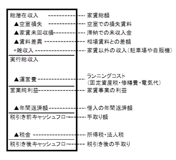 投資分析の基本はキャッシュフローツリーの作成です。これは家賃収入から手取り収入までの一連の流れをまとめたもので、これを理解していれ、資金繰りが原因の土地活用の失敗は大幅に減るといっていいでしょう。