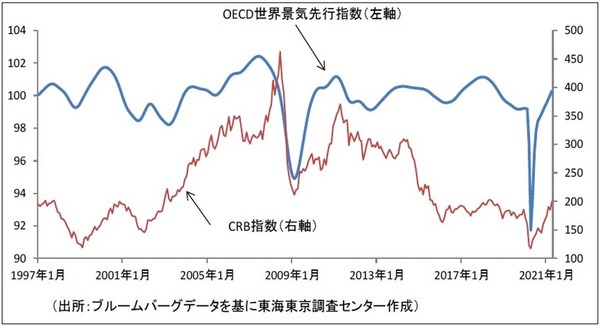 OECDの世界の景気先行指数と「ロイター・コアコモディティCRB指数(代表的な商品関連指数の一つでエネルギー関連が概ね4割を占める)」の推移を見ると、CRB指数の底打ち・上昇サイクルとOECD世界景気先行指数の底打ち・上昇サイクルは概ね一致している(図表2)。