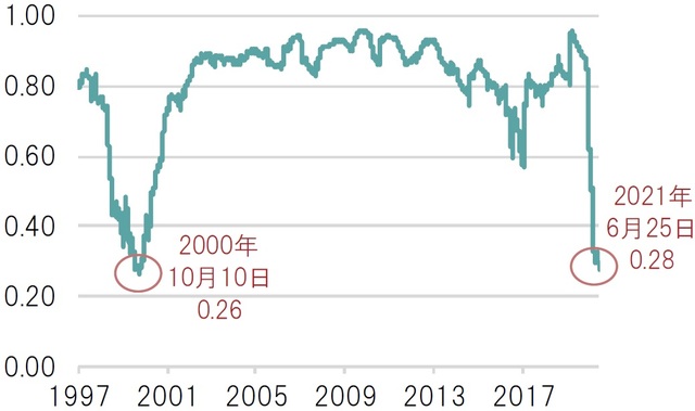 S&P500ピュアバリュー株指数とS&P500ピュアグロース株指数との相関係数が約20年8ヵ月ぶりの水準まで大きく低下している。これは米国の大型バリュー株指数と大型グロース株指数における値動きの連動性が低下していることを意味するわけだが、それがITバブル期に見られた極端な水準まで低下しているため、にわかに注目を集めている(図表1)。