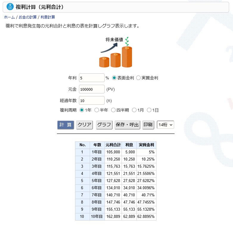 ちなみに、さまざまな複利商品の年率が簡単に計算できるサイトがあります。カシオという会社が運営しているもので、「利息計算」をクリックすると、複利で表面金利と実質金利の年利率を計算できます。