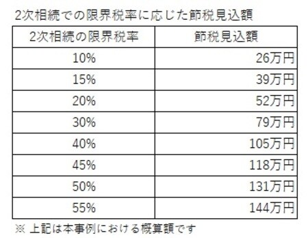 事例では1次相続(夫の相続)で妻が取得した財産は1億円ですので、夫の相続前に持っていた固有財産がなかったとしても、2次相続でも相続税が生じます。その場合の限界税率(課税される税率の中で最も高い税率)は15%ですので、配偶者の納税額262万円×15%≒39万円の節税効果が見込まれます。相続前の妻の固有財産の金額が大きいほど、下記のとおり節税見込額が大きくなります(図表4)。