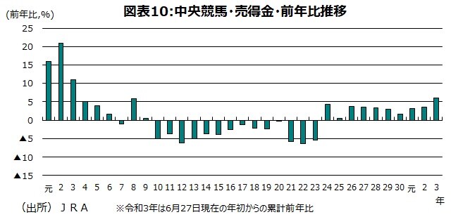 20年のJRA(日本中央競馬会)の売得金は前年比+3.5%と9年連続の増加になった。昨年、無観客レースになった直後は競馬場に来場する人の馬券購入がなくなり売上げが急減したが、徐々にネットでの馬券購入が増加し、20年5月初めを底に売得金・累計前年比が回復した。21年は6月27日時点までの累計前年比は+6.0%の増加になっている(図表10)。G1レースの売得金は3月28日の高松宮記念以降6月27日高松宮記念まで11レース連続で前年比増加している。