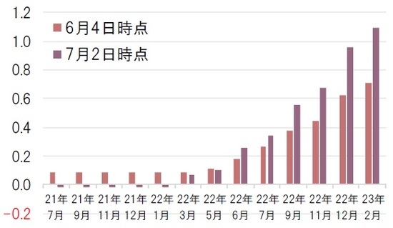 また、その状況はFFレート先物から算出された23年2月FOMCにおける利上げ回数予想の推移を見ても明らかだ。およそ1ヵ月前の23年2月FOMCにおける利上げ回数予想は約0.7回だった。それが、(6月雇用統計を受けて幾分低下したものの)直近は約1.1回と、1回0.25%の利上げが完全に織り込まれている(図表3)。