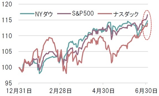 6月米雇用統計の結果は、株式市場が「心地良く」感じられる内容だったのかもしれない。6月非農業部門雇用者数は市場予想の前月比72万人増に対し同85万人増となった一方、平均時給は前月比+0.3%と市場予想の同+0.3%と一致した。これを受けて、米国経済(労働市場)が順調に回復する中で、想定を上回る過度な賃金インフレは見られなかったことから、マーケットが懸念する早期のテーパリング(量的緩和縮小)や利上げ観測が「後退」したと相次いで報じられた。実際、7月2日の米国株式市場はNYダウ、S&P500、ナスダックの3指数がそろって最高値を更新する展開となった(図表1)。