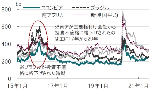 一般にBB格への格下げで投資家は運用制約として投資不適格債に投資できないケースも多く、また、代表的な債券インデックスからも除外されるため、その債券をほぼ同時期に売却することが見られました。例えば、15年末から16年2月に相次いで投資不適格に格下げとなったドル建のブラジル債券のスプレッド(米国国債との利回り格差)は、売却により急拡大しました。ブラジルに限れば、コロナショックでスプレッドが上昇した20年3月よりも大幅な拡大となりました。一方でその後、格下げによる売却一巡後は元の水準に比較的スムーズに戻っていたことなどを考えれば、一斉に同じ投資行動を取ることにもリスクがあることを意識する必要はありそうです。
