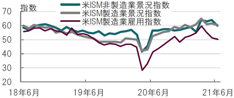 なお、足元で再び長期国債利回りが低下している背景として、米国景気回復にペースダウンの兆しが見られたことがあげられます。例えば、米国の成長率と比較的連動性が高い米ISM製造業雇用指数は依然高水準ながら、6月は市場予想や前月を下回りました(図表2参照)。
