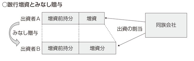 同族会社の増資にあたって、従前の出資割合と異なる出資の割り当てがなされたため、社員の出資持分の価値に変動ないし不均衡が生じた場合(跛行増資という)、その価値の増加した社員は、価値の減少した社員から価値の増加分に相当する金額の贈与を受けたものとみなされる(最高裁昭和38年12月24日判決・訟月10巻2号381頁)。