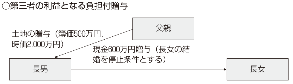 また、その負担額が第三者の利益となる場合には、その第三者がその負担額に相当する金額を贈与により取得したものとされる。この場合、その負担が停止条件付きのものであるときには、その条件が成就したときに贈与を受けたことになる(相基通9-11)。負担付贈与においてその負担額が第三者の利益となる場合とは、以下のようなケースである。