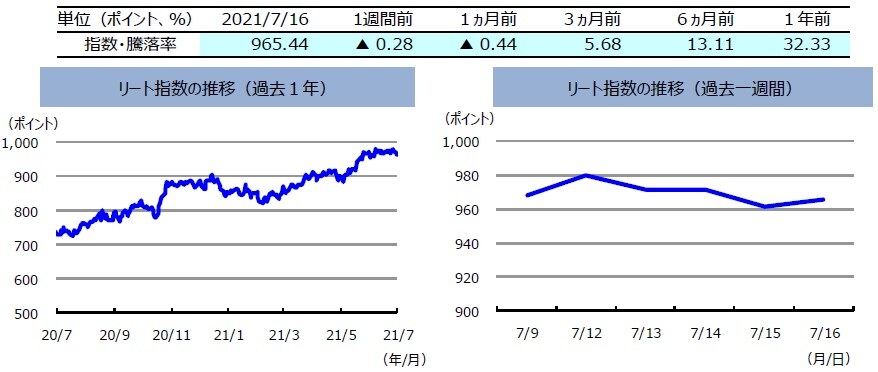 先週の豪州リート指数は、若干下落しました。欧米での長期金利低下などを受けて世界的にリートは上昇しましたが、豪州では感染拡大の抑制のためシドニーのロックダウンの期間を7月末まで再延長するなど景気回復の遅れが懸念されたことにより、週を通して豪州リート市場は若干下落しました。