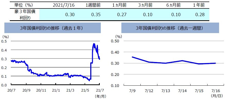先週の豪州3年国債利回りは、低下しました。7月14日のパウエル米連邦準備制度理事会(FRB)議長の早期量的緩和縮小を否定する発言を受けて米長期債利回りは低下しました。豪州3年国債利回りもつられて同様の動きとなり、週間では低下(国債価格は上昇)しました。