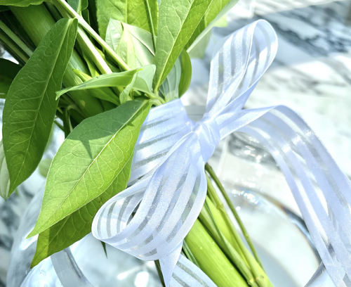 2つ目はリキュウソウ。ツル科の植物で、飾るお花に流れを出したいときに使います。きりっとしたカラーに対して、対照的に柔らかな曲線を出せるリキュウソウを加えることによって、全体的にまとまりがでます。