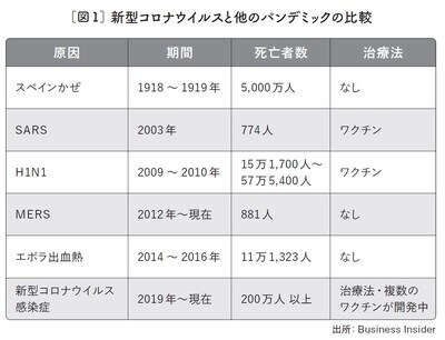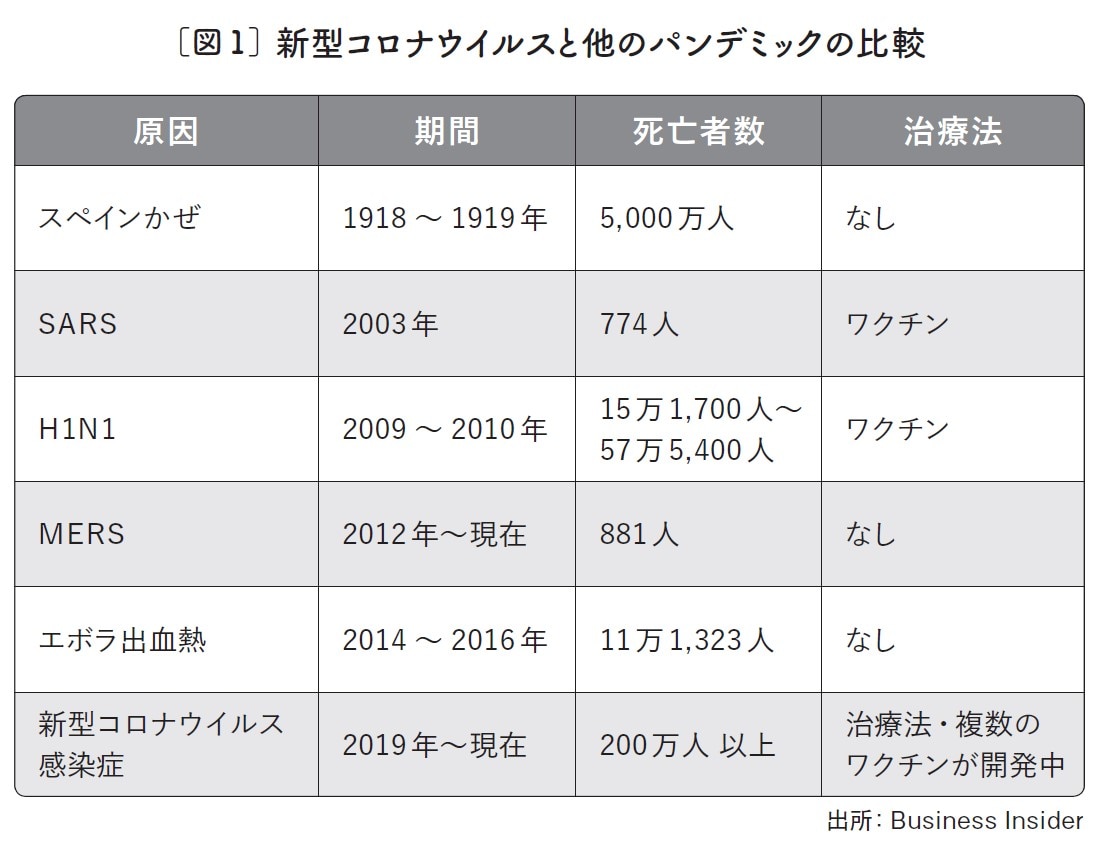 1つめの尺度は、健康上の脅威である。この面では、SARS(重症急性呼吸器症候群)やMERS(中東呼吸器症候群)、豚インフルエンザウイルス(H1N1)、エボラ出血熱、1918年のスペインかぜなど過去の世界的な流行と、新型コロナウイルスを比較できる。