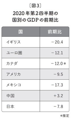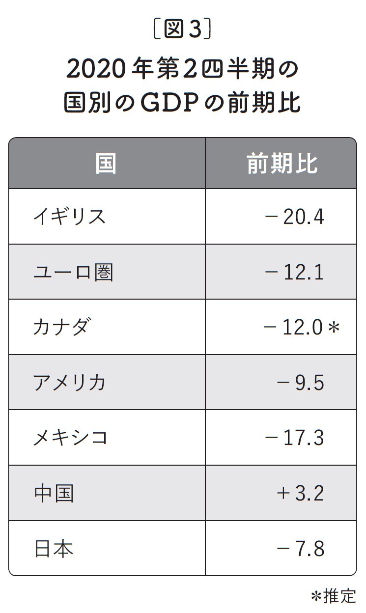 世界経済フォーラムの推定では、2020年第1四半期に世界各地で都市封鎖が相次いだ「グレート・ロックダウン」中に世界のGDPが3%の落ち込みを見せた。2008‐2009年の世界金融危機の際の実に30倍である。欧州連合、イギリス、アメリカを含むG20の国に限ってみると、落ち込みは3・4%とさらに大きくなる[図2]。