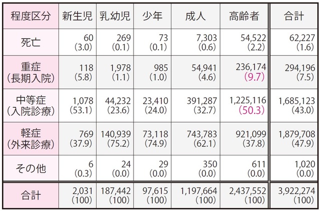 また、その重症度にも特徴があります。急病での救急搬送者のうち軽症ですむ人の割合が、64歳以下(新生児を除く)の場合約60%以上であるのに対し、65歳以上の場合は37.8%まで減ってしまいます。