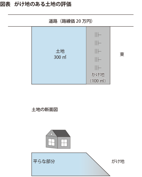 20─4 がけ地等で通常の用途に供することができないと認められる部分を有する宅地の価額は、その宅地のうちに存するがけ地等ががけ地等でないとした場合の価額に、その宅地の総地積に対するがけ地部分等通常の用途に供することができないと認められる部分の地積の割合に応じて付表8「がけ地補正率表」に定める補正率を乗じて計算した価額によって評価する。