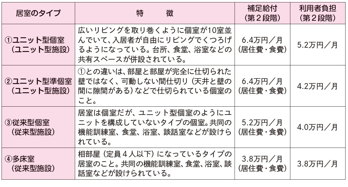利用者負担は原則1割(所得により2割・3割)で、食費と居住費(部屋代)は自己負担となりますが、低所得者には補足給付があります。