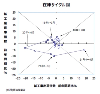 ●鉱工業全体の在庫循環の動きをチェックするために、縦軸に鉱工業在庫指数・前年比、横軸に鉱工業出荷指数・前年比をとった在庫サイクル図をつくると、20年7~9月期までは「在庫調整局面」の状態にあったが、20年10~12月期、21年1~3月期では「意図せざる在庫減局面」になっていた。4~6月期では在庫の前年同月比▲4.8%、出荷が前年の反動もあり、前年同月比+18.7%と2ケタの伸び率になり、「在庫積み増し局面」に入った。