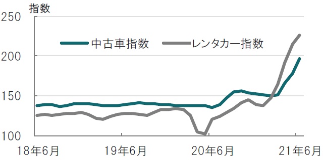 別の具体例を、米国についてご紹介します。米国の6月の消費者物価指数(CPI)は前年比5.4%でした。それでも米当局は物価上昇は一過性との姿勢です。その背景として中古車や航空運賃、宿泊料など新型コロナウイルス関連の一時的要因と判断しているからです。中古車価格が(想定以上に)上昇した要因にレンタカー人気が考えられます。新型コロナの影響で公共交通を回避して自動車を選好しても、半導体不足で新車は購入しづらく、中古車、もしくはレンタカーが人気です。レンタカー会社は、通常新車を購入しレンタル、その後売却して収益を得るのが通常のビジネスモデルです。しかし、新車購入が困難な現状を踏まえ購入した中古車をレンタルしたことも、中古車価格を押し上げた要因と見ています(図表2参照)。