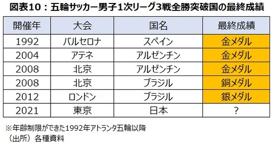 年齢制限が適用されるようになった1992年バルセロナ大会以降、これまで1次リーグを3戦全勝で突破した国は全てメダルを獲得している(図表10)。1968年メキシコ大会の銅メダル以来のメダル獲得が期待される状況だ。