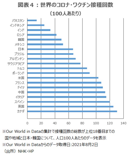 NHKのHPに掲載されている日本の新型コロナウイルスのワクチン接種回数(100人あたり)は、2ヵ月前の6月2日のデータでは、10.45回にすぎず、米国の88.19回に比べかなり少ない状況だった。8月2日のデータでは、66.42回まで増えた。米国の103.35回に比べ、直近2ヵ月間で約3.7倍のペースでワクチン接種が加速したことがわかる(図表4)。