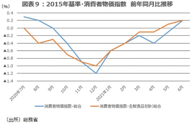 2015年基準の6月分の全国消費者物価指数・生鮮食品を除く総合(コア)は前年同月比+0.2%と2ヵ月連続の上昇(図表9)だが、2020年基準だとプラスにならない可能性が大きい。