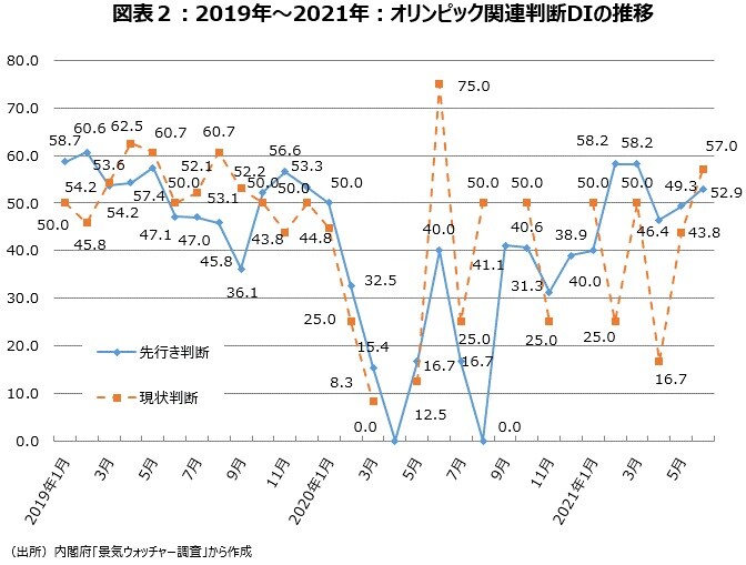 6月の「オリンピック」先行き判断指数DIは52.9と景気分岐点の50を超えてきた。回答数は20年1月と今年5月の152人を大幅に上回る291人と過去最高を更新した。全回答者1,820名の約6分の1がオリンピックに言及したことになる。オリンピックへの関心が高まってきたことが窺える数字である(図表2)。