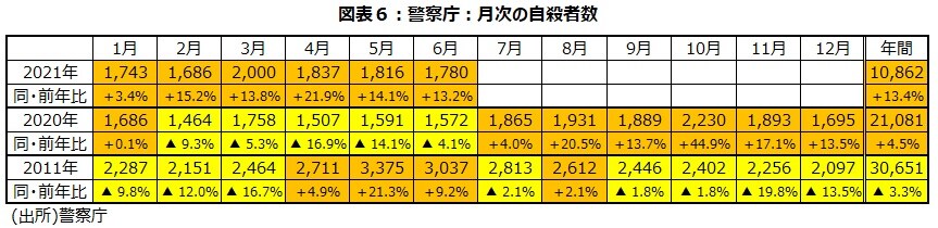 警察庁の自殺者数は、新型コロナウイルス感染拡大により20年で前年比+4.5%の増加と11年ぶりに悪化した。月次でみると、21年6月は+13.2%と12ヵ月連続増加になった(図表6)。