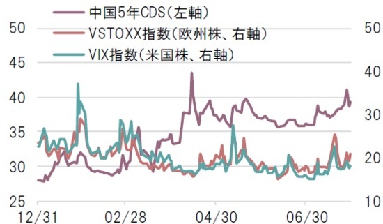 中国5年CDS(クレジット・デフォルト・スワップ、発行体の信用リスクを対象とするデリバティブ契約)はやや上昇したものの、大幅な信用リスクの悪化を示す状況にはない。また、マーケットの不安が高まる局面で上昇する傾向にある米国株や欧州株のインプライド・ボラティリティ指数(VIX指数とVSTOXX指数)も比較的安定している(図表3)。