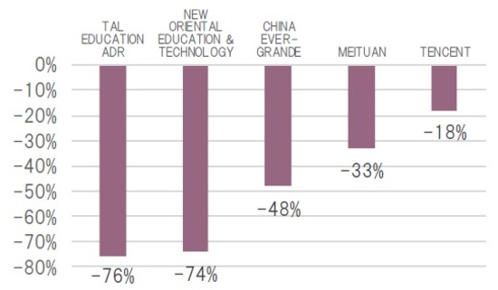その代表的な業界のひとつが教育だ。中国では学習塾の費用が高騰しており、教育格差が問題視されている。このため、小中学生向けの学習塾運営事業者を非営利団体へ移行させるほか、株式市場を通じた資金調達を制限するなど、教育費の増加を是正する構えだ。これを受けて、TAL EducationやNew Oriental Education&Technologyといった中国教育関連株は軒並み暴落した(図表2)。