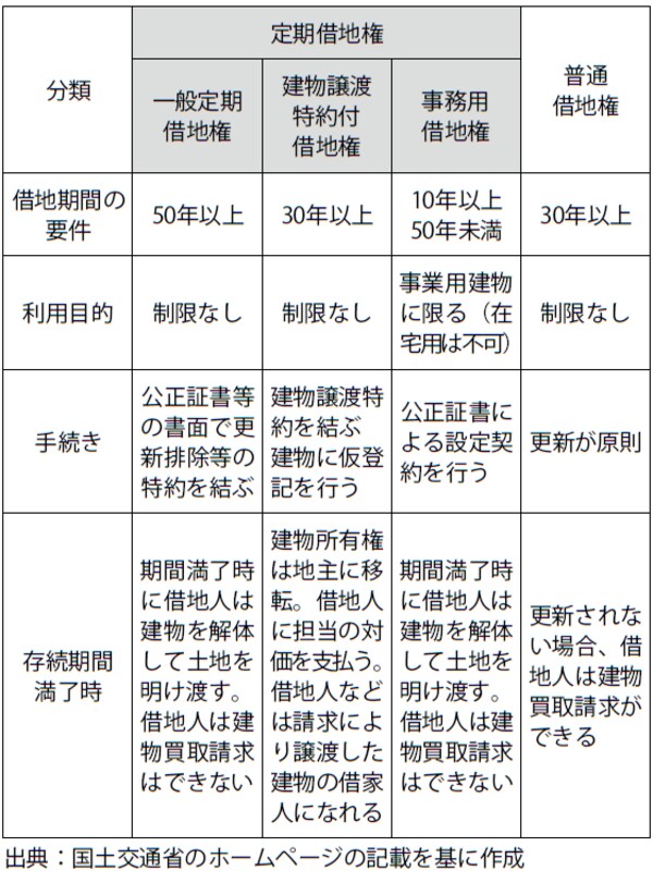 借家人保護の立場が強く所有権同様の効力があるということ、地価が上昇していても地代を上げられないということ、以上の2点より1992年8月1日に開始されました。借地期間満了に伴い必ず土地の返還を求めるタイプの法律が求められ、定期借地権が新設されたのです。そのため、新法借地権の多くは定期借地権となります。定期借地権と普通借地権については、図表を参照してください。