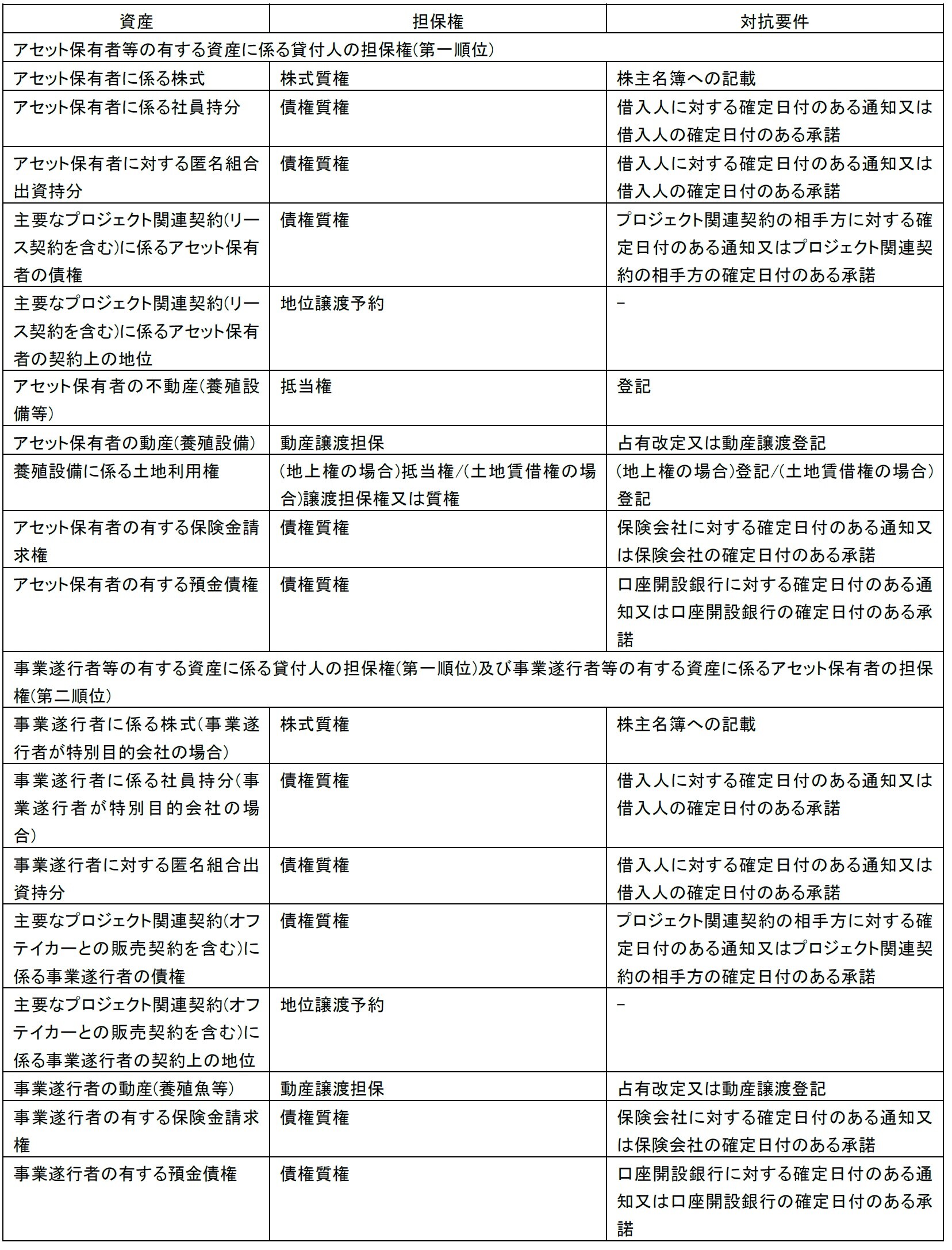 上述したとおり、アセット保有者向けファイナンスはアセット保有者及び事業遂行者の性質や依拠する対象(養殖設備の交換価値かキャッシュフローも含めるか)によってバリエーションが考えられ、セキュリティパッケージもそれぞれの取引に応じたものを検討する必要があると考えられますが、以下では、プロジェクトファイナンス的な側面が強く全資産担保が妥当する場合を検討いたします。この場合、①貸付人がアセット保有者に対して有するローン債権を被担保債権とする貸付人の担保権(第1順位)と②アセット保有者が事業遂行者に対して有するリース料債権を被担保債権とするアセット保有者の担保権(第2順位)の2種類の担保権を含めたセキュリティパッケージを構成する必要がありえる点に留意が必要です。具体的には、以下の資産について以下のような担保権を設定することが考えられます※5。