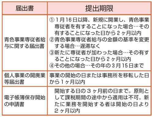 ② 1月16日以後に開業した場合…開業の日から2ヵ月以内に「所得税の青色申告承認申請書」を提出なお、新規開業の場合にはこの他に「個人事業の開廃業等届出書」もあわせて提出しなければなりません。
