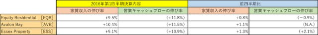 加えて言えば、Equity ResidentialおよびAvalonbay Communitiesの2016年第1四半期の賃料収入が、前四半期比ニューヨーク、ボストン等の東海岸で収入減を示すマイナスを計上しました。