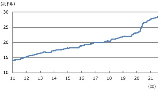 今月1日に復活した債務上限は、28兆5,000億ドルに設定されました。米国の国債発行残高は、直近で約28兆4,600億ドルに達しており(図表2)、米議会予算局(CBO)は、債務上限の復活に伴い、10月にも資金が枯渇する恐れがあるとの見方を示しています。デフォルトを回避するには、債務上限を引き上げる以外に、債務上限の適用を再び停止するという選択肢もあります。