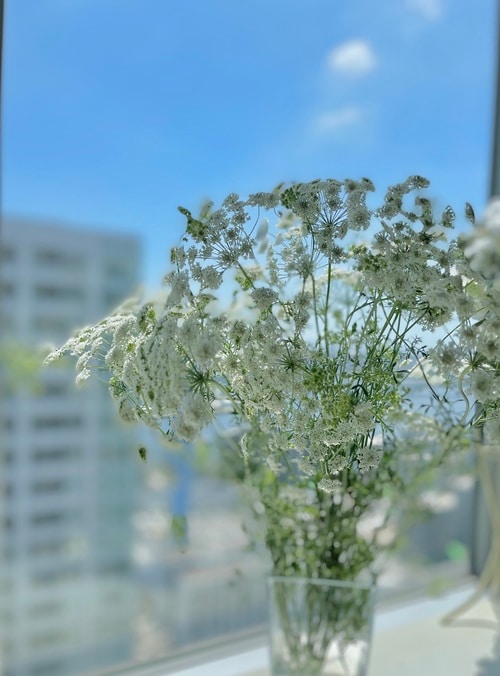 花器はどんなものでも合いますが、暑い時期なので透明や白など、涼しげな色・素材のものを選ぶと良いでしょう。