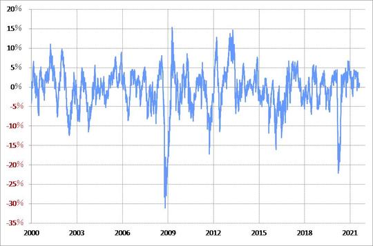 その米金利、米10年債利回りについて、90日MA(移動平均線)との関係を見ると、先週末1.3%割れとなったことで、かい離率はマイナス10%以上に再拡大しました(図表3、4参照)。これは、経験的には「下がり過ぎ」懸念の強い状況が続いていることを示しています。