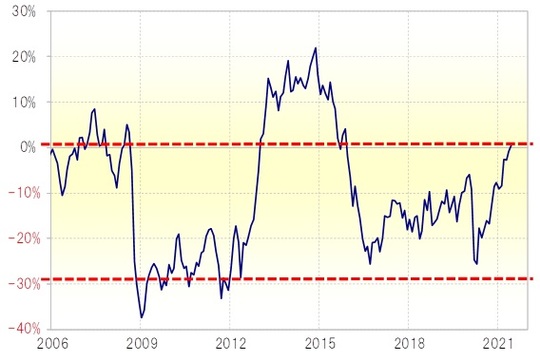 経験的に、同かい離率がプラス5%前後になると、短期的な「上がり過ぎ」懸念が強くなるのですが、その意味では利上げ前はとくに「上がり過ぎ」ではなかったようです。