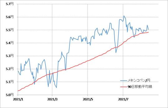 その意味では、5年MA前後は、メキシコペソも含む新興国通貨の中長期的な「上がり過ぎ」警戒域といえそうですが、足元のメキシコペソ/円はまさに5年MA近辺での推移となっているのです(図表8参照)。