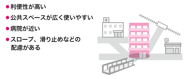 病院が近いことや、スロープがあること、公共スペースの床に滑り止めが施してあることなど、高齢者にとって大事なポイントはまだまだあります。
