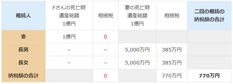 *単純に比較できるように、Fさんの死亡から妻の死亡までの間、妻の財産の増減はないものとしています。