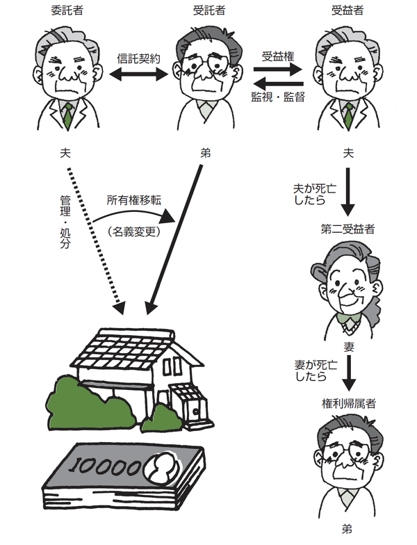 まず、夫が委託者となり、弟を受託者として信託契約を締結します。これにより、財産の名義は弟に移ります。夫が生きている間、託した財産(信託財産)から得られる利益を受け取る人(受益者)は夫自身に設定しておくことで、財産の名義が変わっても現状とほとんど変わらない状態となります。