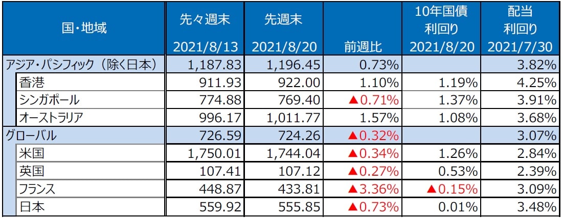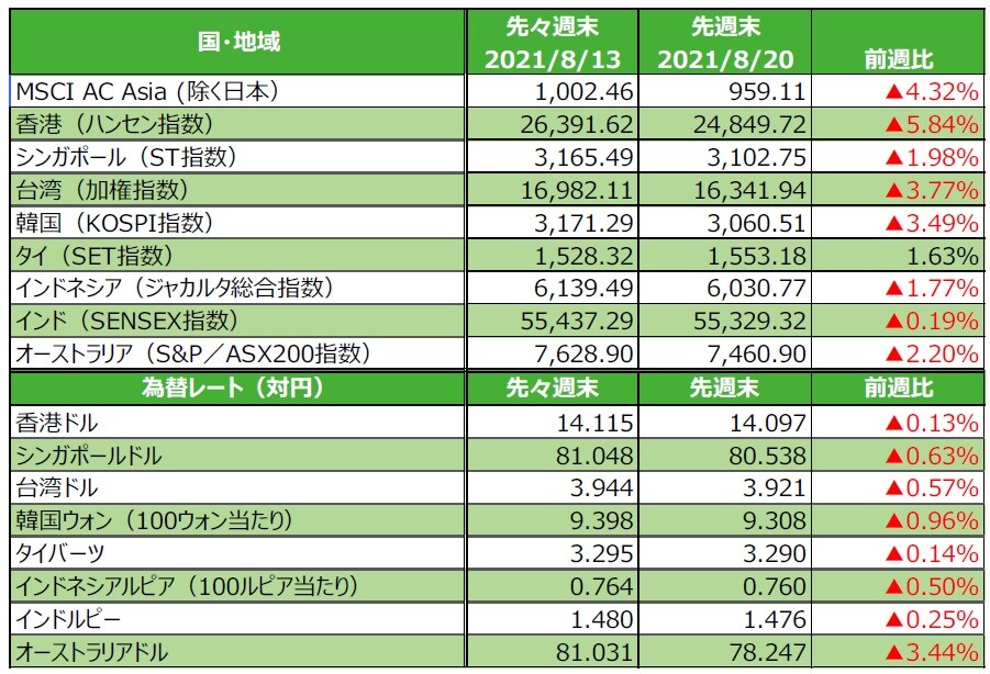 世界の主要株式市場は下落しました。新型コロナウイルスのデルタ型の感染拡大による景気減速や米国の量的金融緩和の早期縮小への懸念が相場の押し下げ要因となりました。米国株式市場は、7月の小売売上が下振れたことや量的金融緩和の早期縮小の見方が高まり、今後の景気鈍化が意識され、売り圧力が高まりました。NYダウは週間では1.11%下落しました。日本株式市場は、デルタ型の感染拡大とその影響による生産活動の低迷見通し、中国の7月の主要経済統計の下振れ等を嫌気して大きく下落しました。週間では日経平均株価は3.45%下落しました。欧州株式市場も、米国株の下落や中国経済の鈍化を懸念して下落しました。独DAX指数は、1.06%、英FTSE100指数は1.81%下落しました。中国株式市場は、7月の小売売上、鉱工業生産等の主要経済統計が下振れたほか、インターネット企業に対する新たな規制強化が発表されたこと等を嫌気して下落しました。また20日には個人情報保護法が成立し、個人データの海外への持ち出しが厳しく制限されることとなりました。上海総合指数は2.53%、香港ハンセン指数は5.84%下落しました。