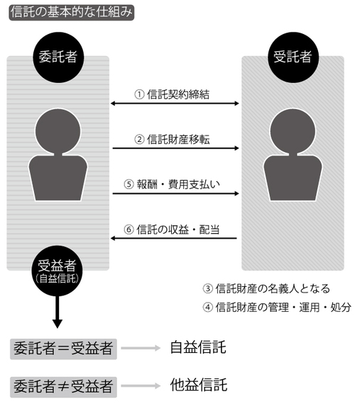 「この法律において『信託』とは、(中略)特定の者が一定の目的(専らその者の利益を図る目的を除く。同条において同じ。)に従い財産の管理又は処分及びその他の当該目的の達成のために必要な行為をすべきものとすることをいう。」(信託法2条1項)。