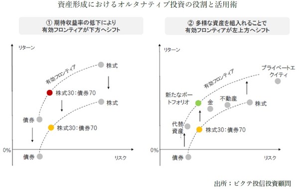 ・株価下落時にオルタナティブ投資資産の価格が上がり、投資資産全体の価格下落を防ぐ効果を期待。