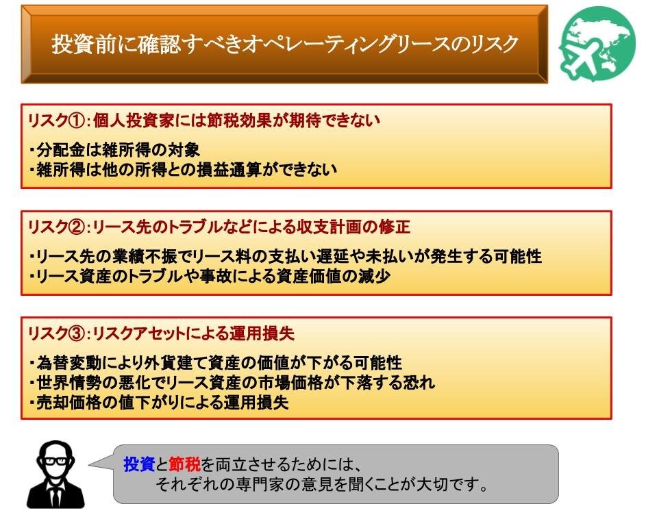 また海外情勢の影響を受けやすいため、飛行機はテロ、コンテナは海賊などによるトラブルが多発すると、市場価値が下落します。そのため売却金額が、リース前に査定した残存価額より低くなるリスクも想定しなければなりません。