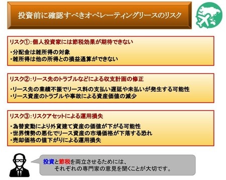 オペレーティングリースを利用した税金対策は、減価償却費などの税務上の損失を利用した節税です。個人投資家が出資した場合、匿名組合からの分配金は雑所得として取り扱われます(組合事業を営業者と共に経営していない場合)。