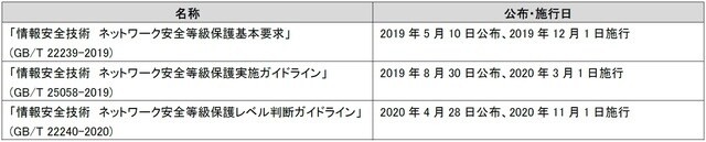 ネットワーク安全等級保護制度は「ネットワーク安全法」第21条で確立された制度であり、確立当時から情報安全責任者の明確化、並びにファイアーウォール、バックアップ及び暗号化等の必要な技術措置が要求されてきました。その後、2018年から2020年にかけて、国家標準化管理委員会は以下をはじめとする一連の国家標準を公布してきました。