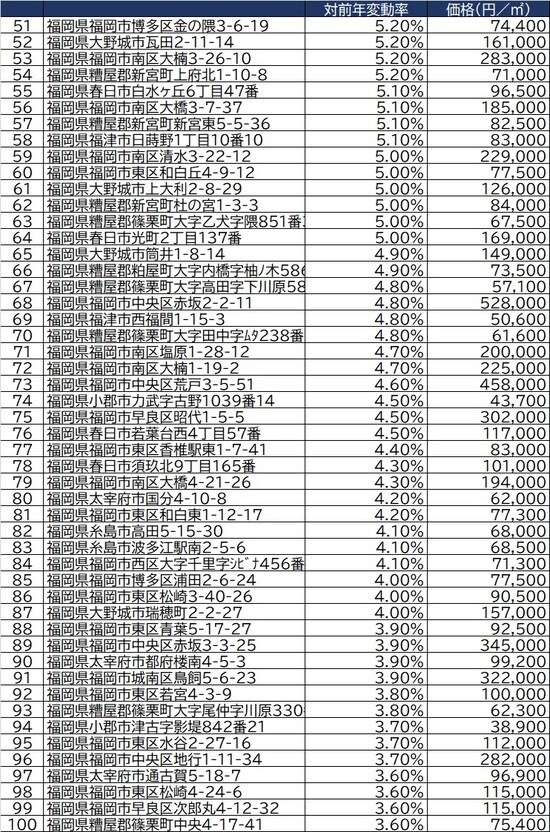 住まい 新築注文住宅 シェア Tweet [連載] 統計から紐解く日本の実情(SGO)【第54-2回】 【2021年】福岡県「住宅地地価ランキング」価格&上昇率ベスト100 GGO編集部 2021.8.28 統計 調査 群馬県 地価 福岡県「住宅地地価」変動率ランキング51~100位